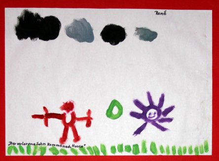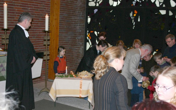 "Lieber Gott, ich bitte darum, dass unser Baby gesund zur Welt kommt, sich gut zurecht findet und Mama genug Milch für's Baby hat." Das war eines der Kindergebete, die Kinder des Kindergartens für den Familiengottesdienst vorbereitet hatten. Auch Dank kam vor: "Lieber Gott, ich danke dir für das Obst und Gemüse" und "Ich danke dir für die Tiere und das Wasser." Hauptsächlich standen die Eltern im Vordergrund der Bitten. Aber die Kinder dachten auch global: "Ich wünsche mir, dass sich die Menschen auf der Welt nicht so oft streiten!" - "Ich wünsche mir, dass alle Menschen glücklich sind." Außer dem Gebet hatten die Kinder sich mit Singen vorbereitet - Song vom verlorenen Sohn. Die getuschten Bilder zierten die lange Wand der Kirche - jetzt im Internet: www.luneansgar.de.vu. Dort steht auch die Bildergeschichte über das Rollenspiel, das Kindergartenkinder spielten. Und das Brot für's Abendmahl war auch im Spielkreis und Kindergarten gebacken.