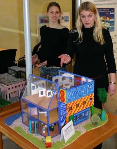 Im Kundenzentrum der Stadtwerke Osterholz-Scharmbeck sind phantasievolle Häuser ausgestellt. Annika Maasz und Nele Kemna, zwei Gymnasiastinnen aus Lunestedt sind Urheber von einem Kunsthaus und einem Jugendhaus. Die Aufgabe von Barabara Jorns, Studienrätin am Gymnasium Osterholz-Scharmbeck lautete: "Phantasievolle Häuser für Kunst, Jugend und Schule". Fünfzehn Schülerinnen und Schüler des Kunst-Leistungskurses im 13. Jahrgang machten sich an die Arbeit, kreative und sachbezogene Hausmodelle zu erstellen. In der Einladung der Stadtwerke stand: "Für das Kundenzentrum sind sie eine Bereicherung. Sie wären es gewiss auch für viele Städte." Annika Maasz hat "das bunte Glashaus" entworfen. Dieses Haus am Wasser sollte an sich schon Kunst darstellen. Annika sagt: "Ich bin ein farbenfroher Mensch." Und genauso zeigt sich ihr Haus. Zudem lassen die großen Glasflächen natürliches Licht ins Haus. Im Erdgeschoss gibt es drei Seminarräume, in denen Kunst entsteht. In einem Raum sind Skulpturen ausgestellt. In der zweiten Etage gibt es ein Café und Restaurant. Zum Wohlfühlen lädt auch ein großes rundes Aquarium ein. Unter dem total aus Glas hergestellten Dach ist Platz für Ausstellungen. Das Haus ist behindertengerecht. Am Rand gibt es einen runden Fahrstuhl. Nele Kemna hat ein "Jugendhaus in den Bergen" gestaltet, das im Harz stehen sollte. Sie hat sich durch eine Jugendtagungsstätte des Roten Kreuzes inspirieren lassen. Auf dem Dach ihres Hauses gibt es ein Schwimmbad mit Rundumblick in die Berge. Darunter liegen die Schlafräume - weil nicht alle an der Außenwand Platz haben, bekommen einige Licht durch Dachkuppeln. Im Erdgeschoss ist Platz für Seminarräume und die Großküche. Nele ist sich nicht ganz sicher, ob es richtig war, nicht nur rechtwinklig zu bauen: "Weil das doch dann teurer wird." Einige Mitschüler haben nur rechteckig gebaut. Ein Schulzentrum hat einen Kasten für die fünfte bis siebte Klasse, einen roten gefensterten Rechteckbau bis zur zehnten Klasse und einen kleineren für die Oberstufe. Nur das Lehrerzimmer ist als kleiner Rundbau angegliedert. Nele meint: "Das Hexenhäuschen ist wohl auch nicht so das Optimum."