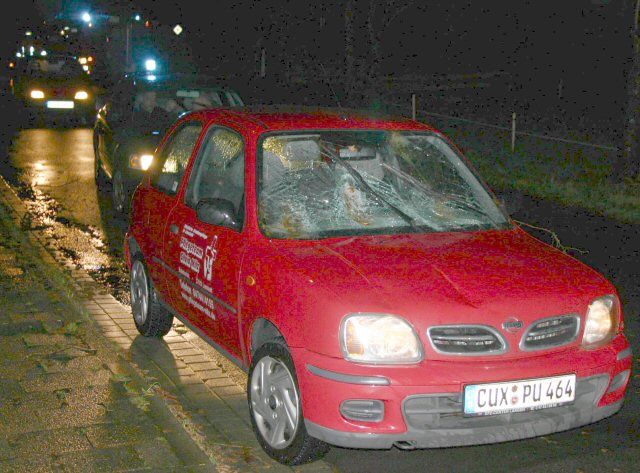 Die Autofahrerin kann mit dem Schrecken davon - nur eine zerstörte Windschutzscheide und eine Reihe von Beulen.