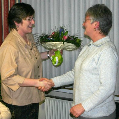 Waltraud Hühnken (rechts) bekommt für ihre langjährige Tätigkeit im DRK von der Vorsitzenden Sigrid Kellmer-Huth einen Blumenstrauß überreicht.