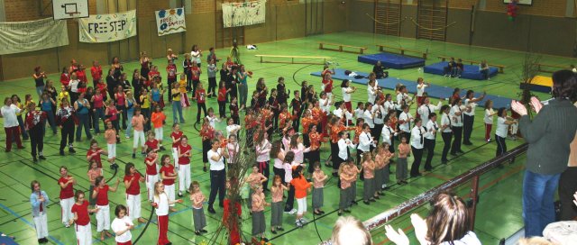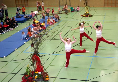 Eine Gruppe (hier aus Selsingen) tanzte, während die anderen auf den Matten ihren Auftritt erwarteten. Die Frühlingsdekoration war von Antje Zlomke und Marion Döbler angefertigt.