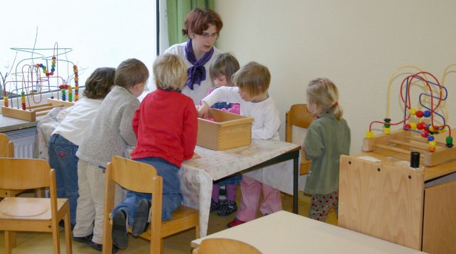 Susanne Sandersfeld mit den Dreijährigen der Kindergartenkleingruppe