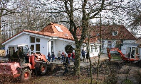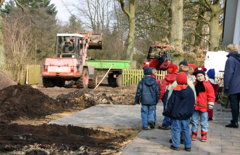 Am Kindergarten arbeiteten ein Minibagger und ein Radlader. Die Kinder beobachten interessiert, wie ihre riesige neue Sandkiste entstand. Ralf Plöger vom Kindergartenbeirat hatte von Unternehmer Uwe Langhans Maschinen geliehen. Mit Martin Woltmann und einigen Eltern gemeinsam kofferte er den Bereich um den neuen Anbau aus. Landwirte holten sich die Muttererde ab. Einen Tag später fuhren die Landwirte Sand aus der gemeindeeigenen Sandgrube heran. Dann bekam die ganze Sandlandschaft eine Umrandung aus Holzbalken. Außerdem wurde die Wippe, die vor den Arbeiten für den Anbau in Sicherheit gebracht worden war, an neuer Stelle aufgebaut. Die Gemeinde bezahlte die Maschinenkosten und die RWG hatte eine Spende dazugetan. So konnten Eltern in Eigenarbeit Spielmöglichkeiten für ihre Kinder schaffen.