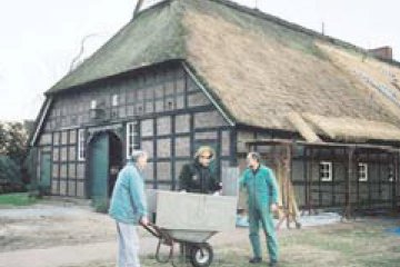 Wohnraum zu schaffen für Schleiereulen, das ist seit Jahren ein Anliegen der Forum-Natur-Lunekring-Freunde in Lunestedt. So wurde jetzt als Ersatz für einen seit 15 Jahren bestehenden Nistraum ein großer Kasten unter das neue Reetdach des Niedersachsenhauses Köser in Lunestedt eingebaut. Fast zwei Dutzend Eulenkästen haben die engagierten Naturschützer in den vorigen Jahren in Lunestedt und umzu in Scheunen, Ställen und Wohnhäusern eingebaut. Fast alle wurden als Unterschlupf genutzt, was schnell an dem typischen Gewölbe zu erkennen war. 2003 konnten erstmals zusammen mit dem Eulenschutzbeauftragten des Landkreises, von Deisten, zwölf Jungvögel beringt werden, um den Flugradius zu verfolgen. Rückmeldungen seien selbst aus Kiew und Schottland von Vögeln, die im Altkreis aufgezogen wurden, notiert worden. Die Lunekring-Freunde sind erreichbar unter T 0 47 48/12 39 oder 0 47 48/10 56. (c) Hermann Kück