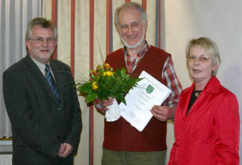 Arnold Plesse (Mitte) erhielt von Bürgermeisterin Linda Woltmann und Gemeindedirektor Ulf Voigts Urkunde und Blumen zur Bestellung als Seniorenbeauftragter.