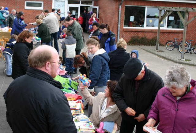 Die gesamte Schulstraße einschließlich der Schul- und Schwimmbadparkplätze verstopft – da musste etwas los sein. Zum „Flohmarkt rund ums Kind“ hatte der TSV Lunestedt geladen, und die Stellplätze in der Turnhalle haben bald nicht mehr ausgereicht. Viele Anbieter hatten sich mit ihren Schätzen schon vor dem Gebäude aufgebaut. Wenn man sich durch die Stände im Flur geschoben hatte, konnte man endlich an dem Geschiebe in der Halle teilhaben. Buntes für Babys Auf Tischen und Ständern lagen und hingen alle Arten von Kinderkleidern. Bücher und Spielsachen für Babys und Ältere rundeten das Angebot ab. Auch die Leitern und Wände der Halle waren dicht behängt mit Fundstücken für Schnäppchenjäger. Wer von dem Gewühle genug hatte – ob entnervt ohne Erworbenes oder glücklich nach dem Kauf – hatte die Möglichkeit, bei Kaffee und Kuchen zu entspannen. Der einzige Raum ohne Gedränge bot viel fürs leibliche Wohl. Etwa 80 Plätze waren allerdings als „reserviert“ gekennzeichnet: Die Aktiven der Wanderabteilung hatten sich angesagt. Sie machten die Frühjahrswanderung rund um Lunestedt und labten sich im Café. Durch Standmieten, Kuchenverkauf und die Wandergruppe konnte die Abteilung Turnen einen Erlös von mehr als 700 Euro verzeichnen, der komplett in die Kinderturngruppen zurückfließt.