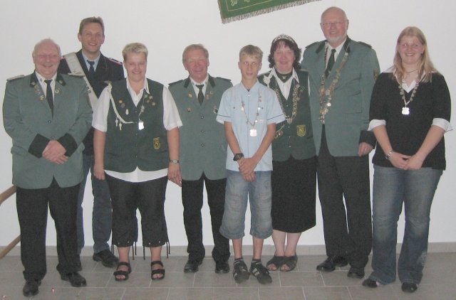 Die neuen Majestäten (von links): Vorsitzender Claus-Dieter Block, Schlauchkönig Björn Drews, Vizekönigin Sonja Sebberdt, Vizekönig Hans-Jochen Otten, Schülerkönig Julian Wagenschütz, Schützenkönigin Iris Siedenburg, Schützenkönig Bernhard Harfst, Jugendkönigin Verena Ehlers.