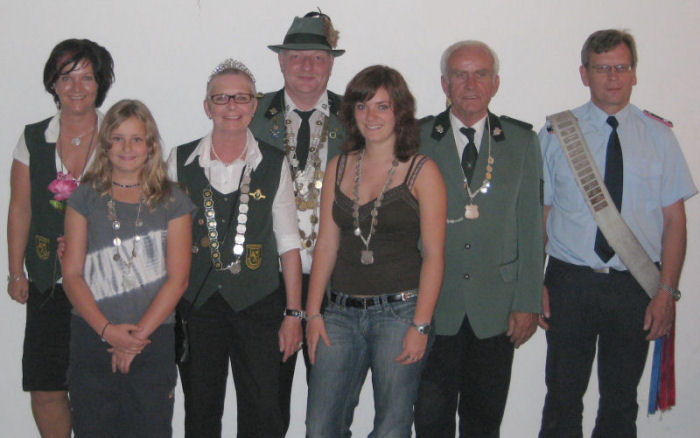 V.l.: Vize Königin Sabine Oldenburg, Schülerkönigin Angelique Nordholz, Königin Linda Woltmann, König und 1. Vors. Claus-Dieter Block, Jugendkönigin Britta Musall, Vize König Gustav Bernshausen, Schlauchkönig Ewald Frömming