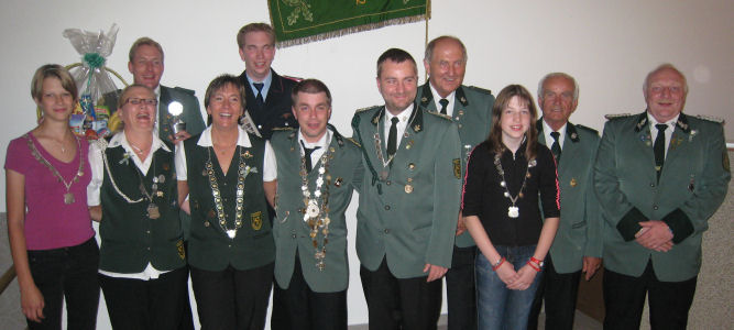 Von links: Jugendkönigin: Jessie Woltmann, Vize Königin: Marion Bultmann, Krause Pokal: Alexander Kück, Königin: Astrid Woltmann, Schlauchkönig: Clemens Bock, König: Gunnar Niesel, Vize König: Alf Sebberdt, Volksvogel II König: Claus Götjen, Schülerkönigin: Priska Siedenburg, Volksvogel I König: Gustav Bernshausen und der 1. Vorsitzende Claus-Dieter Block.